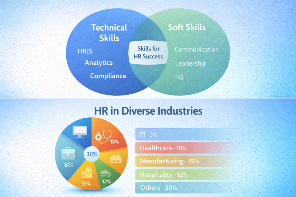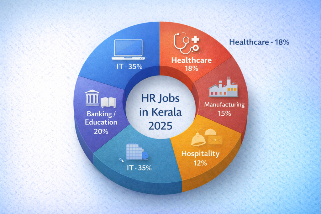 Top Hiring Sectors (2025): Information Technology leads with 35% of HR jobs, followed by Healthcare (18%), Manufacturing (15%), Hospitality (12%), and Banking/Education (20%). All sectors actively recruit graduates from professional HR courses in Kerala.