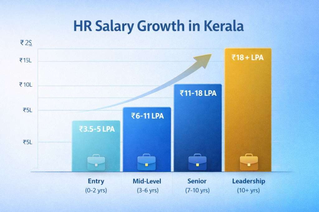 Quick Salary Guide: Entry-level HR professionals with certifications from recognized HR courses in Kerala earn ₹3.5-5 LPA. Mid-level (3-6 years): ₹6-11 LPA. Senior (7-10 years): ₹11-18 LPA. Leadership (10+ years): ₹18+ LPA. Kochi offers 10-15% premium over other Kerala cities.