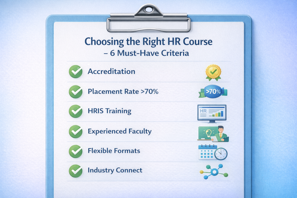 Key Criteria: When selecting among HR courses in Kerala, prioritize accreditation, 70%+ placement rates, hands-on HRIS training, experienced faculty, and flexible learning formats that match your schedule and career goals.